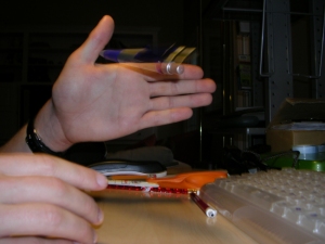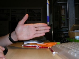 Although it looks like I'm just balancing this pen on my hand, this is actually mid-flight. This illustrates one of the main techniques of Pen Vaulting. You want the center of balance (the middle of the pen) to clear your hand, so you want to have the pen spin in such a way as to allow the center of the pen to come as close to your hand as possible. The best way to do this is to let the pen roll over your hand.