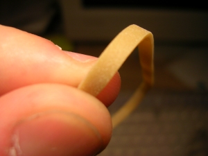 An excellent dramatic shot of an exemplary rubber band specimen You can't really go wrong when choosing a rubber band. Just make sure that it isn't old and dry rotted and that it has plenty of flex to it. |