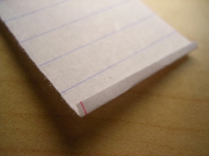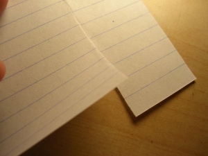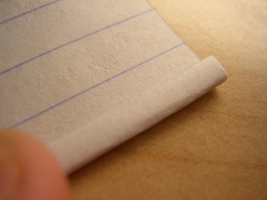 The first thing you need is a strip of paper. The regulation size for a wasp is margin width. The ideal method for cutting a piece of paper is creasing it back and forth several times along the line you wish to cut, then ripping the whole sheet in half and crumpling it up. On your second try, you may want to wet the crease with a swift lick of the tongue. This will aid in the tearing process. (be careful! A paper cut is no way to injure yourself before battle). |