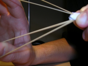 Hold the wasp in your other hand so that the rubber band falls into the V of the wasp. If you made it well, you shouldn't have to pinch the wasp too hard, because its rigidity should hold it in place. Here's a picture: |